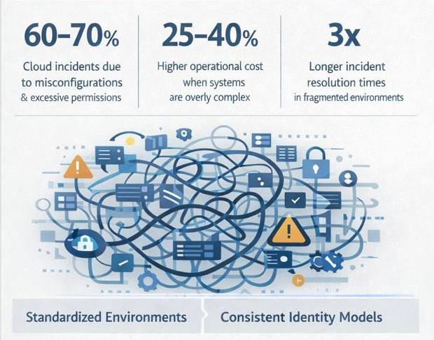 The impact of complexity is measurable. Industry analyses consistently show that the majority of cloud and security incidents — often estimated at 60–70% — stem from misconfiguration, excessive permissions, or unclear system boundaries, rather than from novel attack techniques. Each additional platform, integration, or exception increases the number of possible failure paths and reduces overall visibility.