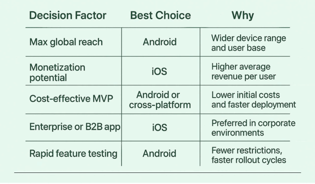 For apps requiring scale, flexibility, or lower device costs, Android offers unmatched reach.