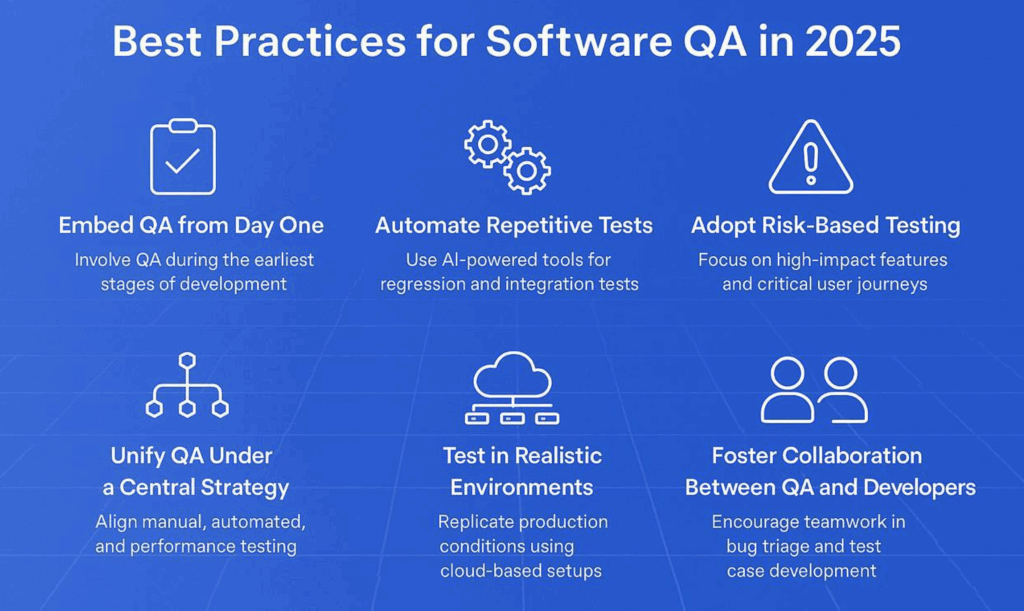 In 2025, quality assurance is not just a checkpoint at the end of the development pipeline—it is the backbone of reliable, scalable, and user-focused software. Businesses that succeed in delivering high-performing applications share a common approach: they embed QA into their culture, automate wherever possible, and align quality goals with business outcomes. Below are the practices shaping effective QA strategies today.