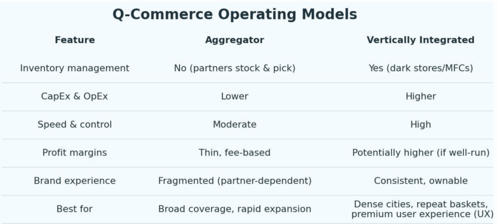 Two patterns dominate. Aggregators orchestrate delivery for third-party stores and do not own inventory. They expand quickly, require less capital, and monetize through fees, but their control over assortment, picking quality, and margin is limited. Vertically integrated operators run dark stores and own the full experience. They decide the range, the planogram, and the price, and they capture more value per order—at the cost of leases, staffing, and working capital. A pragmatic path is to validate demand with an aggregator footprint, then convert dense zones to vertical operations where basket repeatability justifies fixed costs.