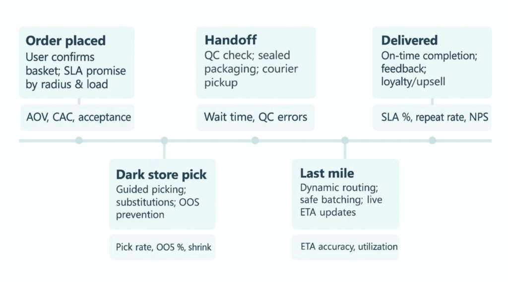 Healthy Q-commerce is built on contribution margin per order, not GMV. Average order value, gross margin, cost to pick, cost to deliver, packaging, refunds and promotions determine whether each order helps or hurts. In practice that means AOVs in the high-teens to mid-twenties for grocery-heavy baskets, pick rates north of a hundred lines per hour in stable stores, and rider utilization that keeps paid minutes concentrated on active jobs rather than idle waiting. Promise control protects the P&L as much as reputation: if a zone is spiking, it is better to decline a marginal order than to accept it and miss the SLA, pay compensation, and lose the next three orders from that user.