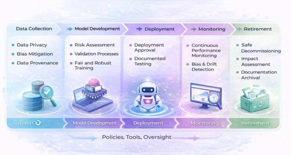 In practice, this means implementing policies that govern the entire AI lifecycle — from data collection and model development to deployment, monitoring, and retirement.