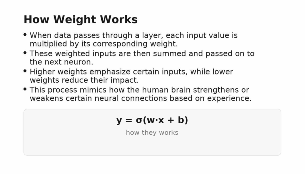 A simple way to think about it: weights act like volume knobs on features. In a spam filter, words like “free” or “winner” may get higher weights, while “invoice” might get a negative one. In image models, tiny grids of weights scan a picture and light up when they see patterns like edges or textures. Over many training steps, helpful patterns get stronger weights, unhelpful ones fade, and the model learns which parts of the input truly matter. Combined with a bias (a small offset that shifts the decision threshold), weights let the network make flexible, accurate decisions across many kinds of data.