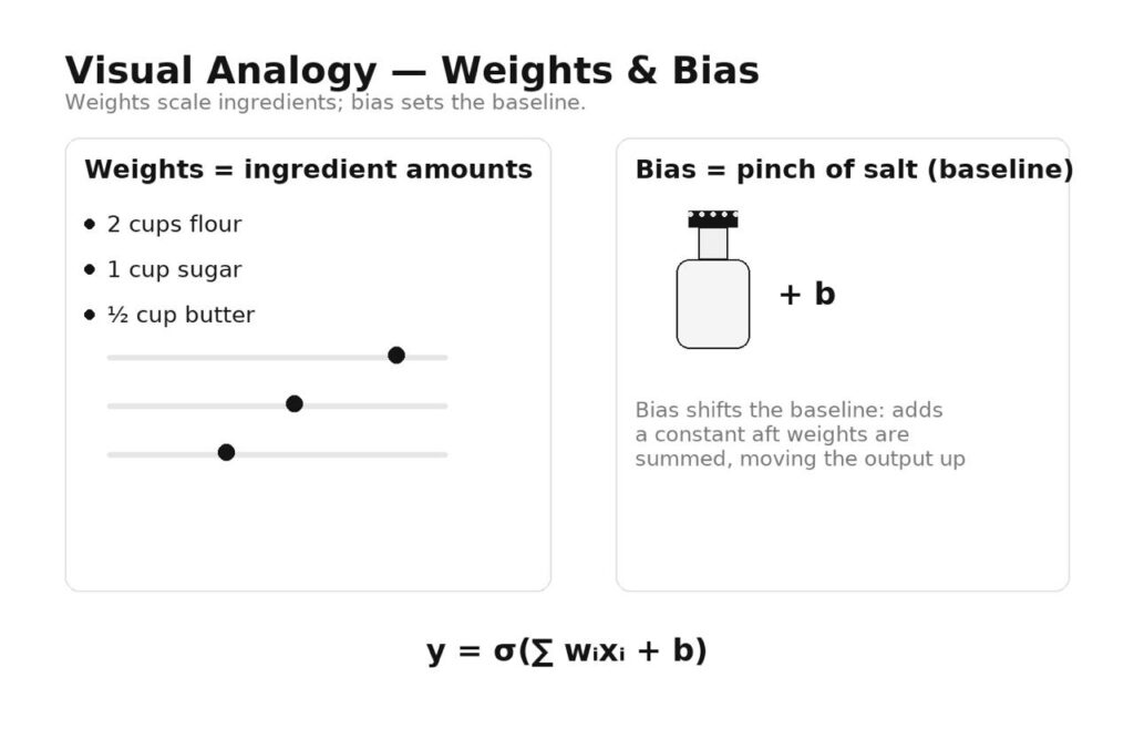 Each input feature is like an ingredient: flour, sugar, butter. The weight says how much of that ingredient you add. Double the weight for sugar and the cake gets sweeter; reduce the weight for butter and it gets drier. During training, the model keeps nudging these amounts up or down to improve the “taste” (its predictions).
