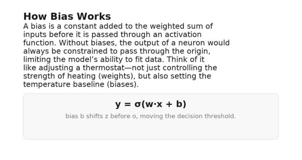 In practice, the bias controls the threshold. In a spam classifier, the bias reflects the default tendency (e.g., “not spam” unless strong evidence appears); nudging it changes how much evidence is needed to switch the prediction. In a convolutional layer, the bias sets how strong an edge or texture must be before the filter activates. Biases also help with calibration: small adjustments can align predicted probabilities with reality and reduce false positives/negatives—often without retraining everything.