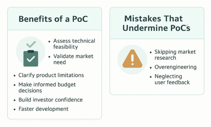 Many teams fail by misusing the PoC stage. Some skip market research, proving technology without confirming that the solution has real-world demand. Others overengineer, turning what should be a quick experiment into a pseudo-product. Still others neglect to gather feedback, leaving assumptions untested. In each case, the opportunity to reduce risk is lost. The strength of a PoC lies in focus: it must remain simple, lean, and validated by external input.