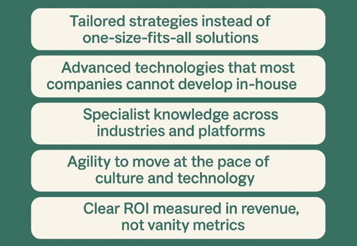 In-house teams may be strong in one or two areas, but rarely do they combine creative storytelling, deep analytics, technical SEO, paid media expertise, and cultural fluency under one roof. Agencies, on the other hand, employ specialized multidisciplinary teams that can cover the full spectrum. That breadth is what makes them indispensable in 2025.